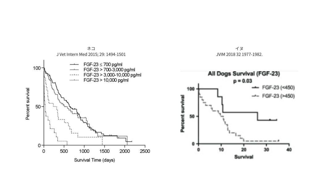 犬についても報告は少ないですが、猫と同様にFGF-23が高値であると生存期間が短そうです。(他の要因も関係しているかもしれません。)