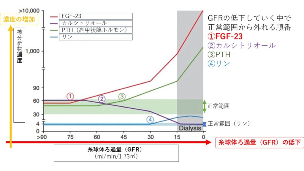 糸球体ろ過量(GFR)が低下していく中でリンの上昇より前にFGF-23が最も早く上昇する。