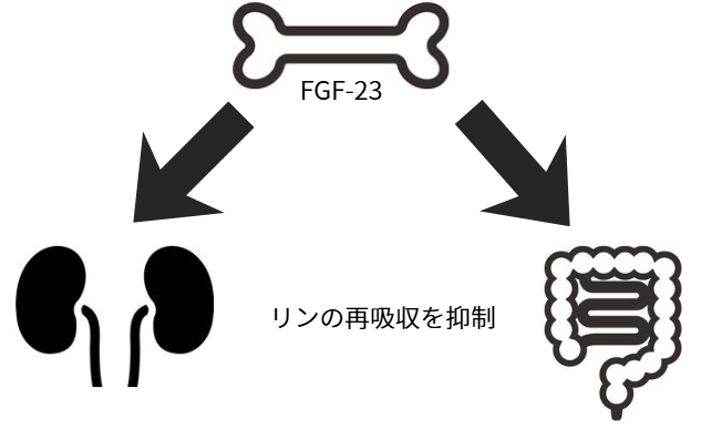 FGF-23は、主に骨細胞から分泌されるホルモンで、2つの主な働きにより血中のリン濃度を下げます。